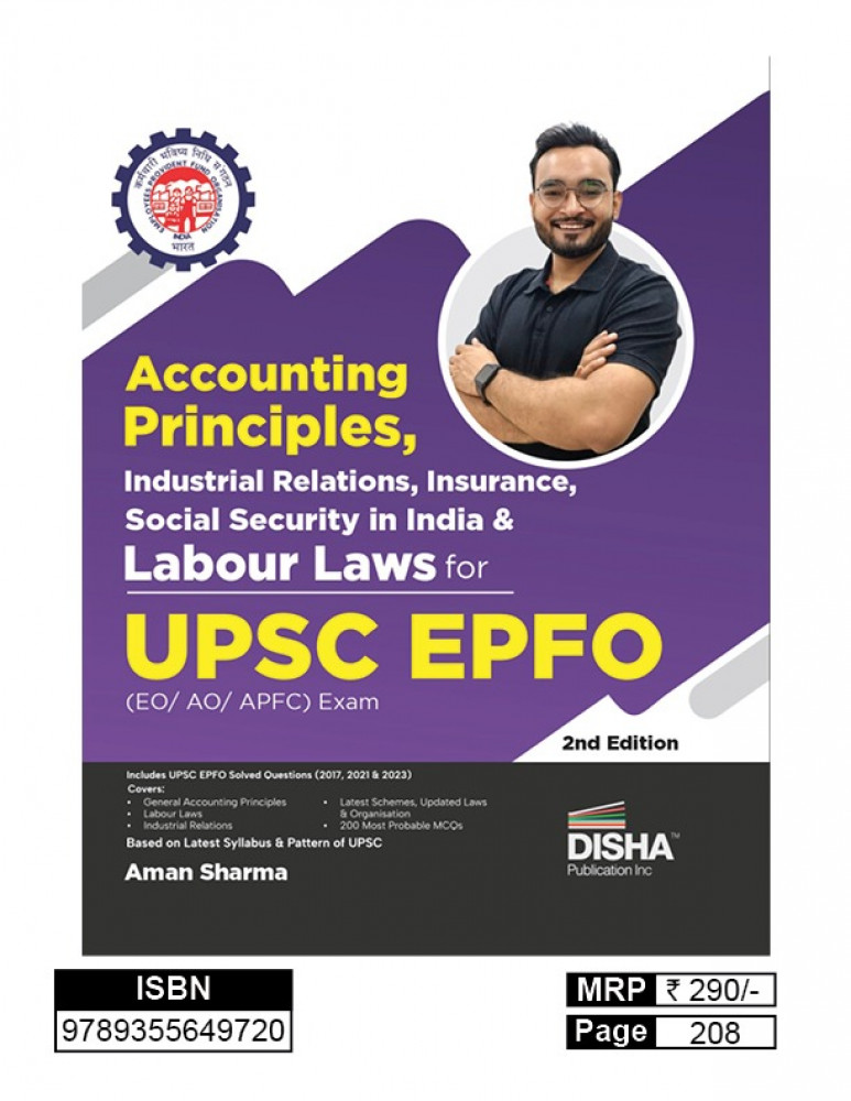 Based on the latest UPSC EPFO syllabus and exam pattern. Covers General Accounting Principles, Labour Laws, Industrial Relations, Insurance, Social Security, latest schemes & updated laws. Includes solved questions (2017, 2021 & 2023) and 200+ probable MCQs. Author: Aman Sharma. 2nd Edition, 208 Pages.