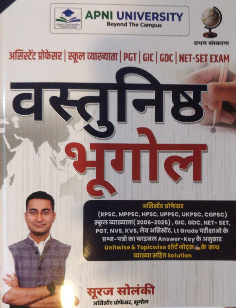 Objective Geography book for Assistant Professor, School Lecturer, PGT, GIC, GDC, NET-SET and other exams with unit-wise and topic-wise solutions. Apni University Vastunishth Bhugol Objective Geography Book by Suraj Solanki Sir